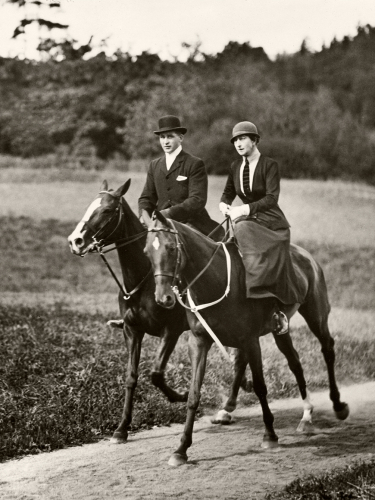 Dronning Maud i sidesal på «Diamond» og rideknekten Alfred Cobb på «Emerald» under en ridetur på Bygdøy på 1930-tallet. Fra Dronning Mauds fotoalbum, De kongelige samlinger.