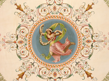 Her har jeg valgt en pompejansk Decoration, nemlig paa pudsede Vægge med livlige Farger i en let Stiil malet. Blant alle Arter av Decorationer frembringe de pompeianske, eller de, som ere efterlignende de Mønstre, som ere udgravede i Ruinerne af Pompeij, Herculanum og Stabiæ en Slags Pragt med mindst Anvendelse af Bekostning, da de kunde udføres blot i Limfarge paa en slet Væg.