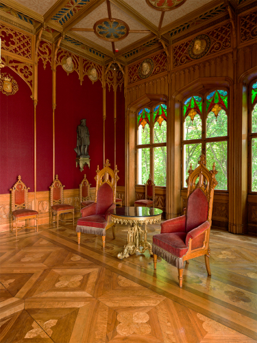 Álgoálggus lei Nebelong sárgos smávvaruvttot lásiid Oscarshálla lanjaide, muhto Gonagas Oscar I hálidii baicca stuora láseruvttuid vai Saloŋgga attaii čuovgadeabbon. Dasto orro ge vel čielgaseappot dovdomin ahte olmmo lea dego gárdinstobus, juste nu movt dan áiggi romantihkala arkitektuvrra ulbmil lei ge, ahte leahkit nu lahka luonddu go vejola.
