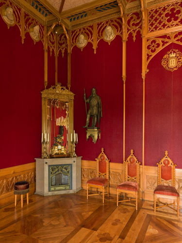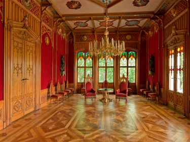 Saloŋgga seaidneguorain leat 18 allačielggat ođđagotihkala stuolu. Stuolut leat olggotuvvon seammalágan rukses fløyeliin go dat mii lea seinniin ja stuolločilggiide lea gonagas Oscar I monográmma gorrojuvvon. Guokte giehtastuolu maid Gonagas Oscar I ja Dronnet Joséphine galggaiga geavahit go vuostáiválddiiga gussiid, leat láhtis goabbatbealde gellehuvvon beavddi mas lea marmorpláhtta.