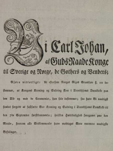 Gonagas Carl Johan ruvdnejuvvui Stockholma Storkyrkanis miessemánu 11. beaivvi. Norgga álbmoga ovddasteaddjin lei stuoradiggeáirrasjoavku. Ruvdnen Norggas čađahuvvui juo seamma geasi. 1814 Vuođđolága, paragráfa 10 – nugohčoduvvon ruvdnenpragráfa, bidjá Troandin duopmogirkui ruvdnengirkoárvvu Norggas, ja ođđa gonagas áiggui geavahit dan guhkes mátki oahpásnuvvat buorebut riikkain.