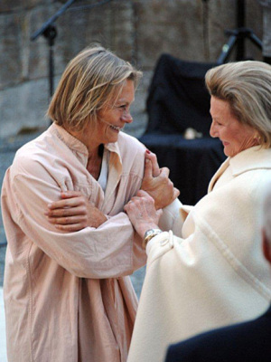 Jeanne d'Arc7. juni: Kongen og Dronningen er tilskuere under Juni Dahrs framføring av Jeanne d'Arc på Oscarshall. Her, Dronning Sonja med Juni Dahr etter forestillingen (Foto: Sven Gj. Gjeruldsen, Det kongelige hoff) -