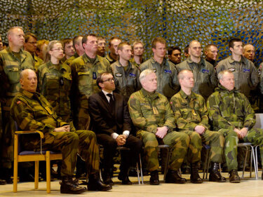 Minnestund18. mars: Kong Harald er til stede ved minnestunden for de fem som omkom da C-130J Hercules styrtet ved Kebnekaise (Foto: Stian Lysberg Solum / Scanpix) -