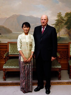 Nobelaudiens16. juni: Kong Harald tar i mot fredsprisvinner Aung San Suu Kyi i audiens på Slottet. Dronning Sonja og Kronprins Haakon er også til stede under audiensen (Foto: Lise Åserud / NTB scanpix) -