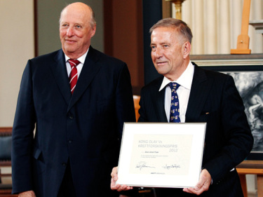 Kreftforskningspris11. juni: Kong Harald overrekker Kong Olav Vs Kreftforskningspris 2012 til professor Claes Göran Tropé i dag (Foto: Erlend Aas / NTB scanpix) -