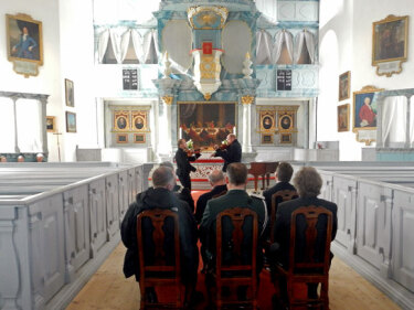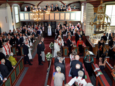 Røros kirke30. april: Kongen besøker den karakteristiske kirken på Røros, der han fikk informasjon om restaureringsarbeidet og Røros' kirkes historie (Foto: Sven Gj. Gjeruldsen, Det kongelige hoff) -