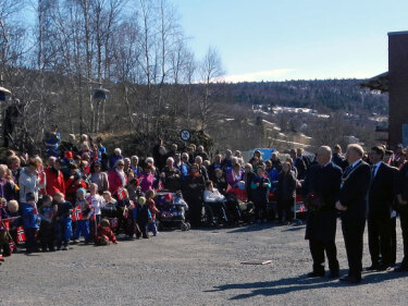 Holtålen kommune30. april: Kongen ble møtt av bygdas befolkning da han besøkte Ålen sentrum som ble hardt rammet av flom i august i 2011 (Foto: Sven Gj. Gjeruldsen, Det kongelige hoff) -