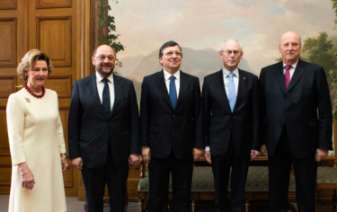 Audiens10. desember: Kong Harald og Dronning Sonja tar i mot årets fredsprismottakere i audiens: EU-president Herman Van Rompuy (f.h.), president i EU kommisjonen, José Manuel Barroso, og president i EU-parlamentet, Martin Schulz (Foto: Berit Roald / NTB scanpix) -