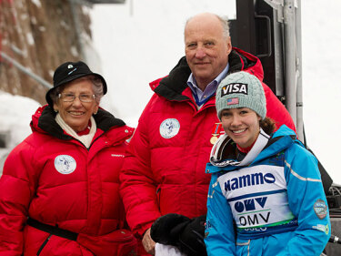 Holmenkollen9. - 10. mars: Kong Harald og Prinsesse Astrid, fru Ferner er til stede under World Cup på ski i Holmenkollen. Her gratulerer de vinneren av hopp for kvinner, amerikanske Sarah Hendrickson (Foto: Terje Bendiksby / Scanpix) -