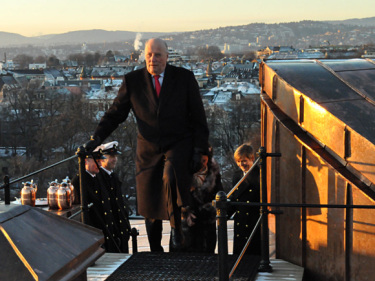 Slottets tak11. desember: Kong Harald og Dronning Sonja får formelt overrakt Slottets nye tak. Restaureringen av slottstaket er ferdig, noe som ble markert med en kort seremoni – på taket. (Foto: Sven Gj. Gjeruldsen, Det kongelige hoff) -