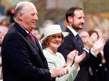 Nobelforedrag16. juni: Kong Harald, Dronning Sonja og Kronprins Haakon er til stede under fredsprisvinner Aung San Suu Kyis Nobelforedrag i Oslo Rådhus (Foto: Lise Åserud / NTB scanpix) -