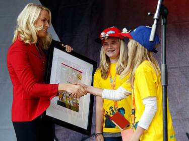 Vennergi- dagen27. mai: Kronprinsesse Mette-Marit deler ut prisen til Årets Regnmaker - Evje Skole i Bærum - under Regnmakernes Vennergidag på Domkirkeodden i Hamar (Foto: Lise Åserud / Scanpix) -