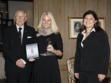 Tora Mostrastong- prisen18. november: Kronprinsesse Mette-Marit mottar Tora Mostrastongprisen fra initiativtaker Håkon Randal og styreleder Birthe Taraldset (Foto: Eva Groven, Budstikka) -