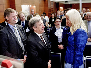 Nansenkonferansen6. juni: Kronprinsessen åpner Nansenkonferansen om klimaendringer og folk på flukt. Hilser her på hilser på FNs høykommissær for flyktninger, António Guterres, og statsråd Erik Solheim (Foto: Scanpix) -