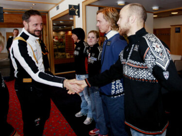 Ski-VM: Dag 61. mars: Kronprins Haakon ser 15-kilometer klassisk for herrer i Kollen. Om ettermiddagen besøker Kongeparet og Kronprinsen de norske deltakere på Soria Moria, der mange av dem bor under mesterskapet. Hilser her på Tord Asle Gjerdalen (.Foto: Lise Åserud / Scanpix) -