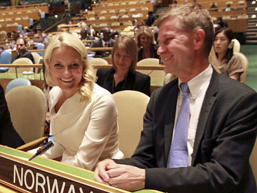 FN-møte om AIDS7. - 9. juni: Kronprinsessen deltar på FNs Generalforsamlings Høynivåmøte om AIDS i New York. Her i på Norges plass i salen sammen med statsråd Erik Solheim (Foto: UD/Scanpix) -