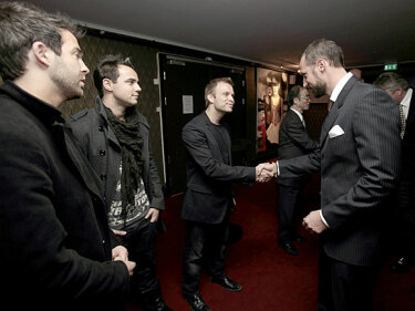 Støttekonsert21. mars: Kronprins Haakon er til stede under støttekonserten Gift to Japan på Folketeateret i Oslo. Hilser her på et av bandene som deltok, A1. (Foto: Scanpix) -