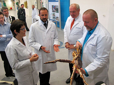 Håp i havet10. februar: Kronprins Haakon åpner konferansen "Håp i havet" i Tromsø og besøker forskningsselskapet Nofima. Forsker Kjell Midling forteller Kronprinsen om kongekrabben (Foto: Liv Anette Luane Kristensen, Det kongelige hoff). -