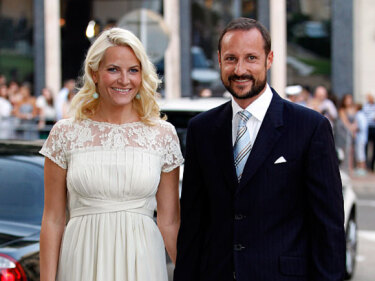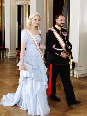 Statsbesøk fra Litauen5. april: Kronprinsparet deltar i seremonien som ønsker Litauens president velkommen til Norge. Her ankommer de gallamiddagen på Slottet til ære for presidenten (Foto: Erlend Aas / Scanpix) -