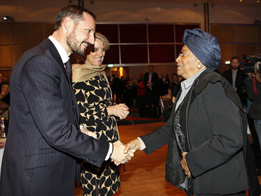 Norads konferanse12. desember: Kronprins Haakon deltar på Norad-konferansen i Oslo. Her møter han blant annet fredsprisvinner og president i Liberia Ellen Johnson Sirleaf (Foto: Håkon Mosvold Larsen, Scanpix) -