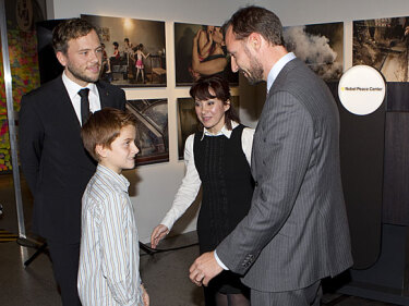 Årets forbilde14. november: Kronprinsen er til stede på utdelingen av Årets forbilde. Cecilia Dinardi fikk prisen for sitt arbeid og sterke engasjement for barnevernsbarn og asylsøkerbarn.Her: Statsråd Audun Lysbakken, prisvinner Cecilia Dinardi, hennes sønn og Kronprins Haakon på Nobels Fredssenter (Foto: Morten Holm, Scanpix) -