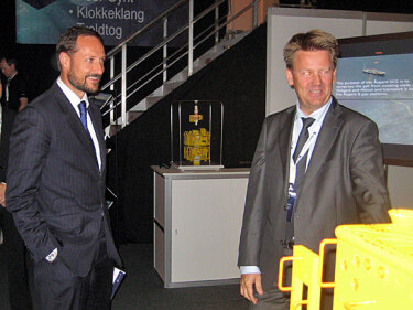 UTC8. juni: Kronprins Haakon er til stede på åpningen av den internasjonale undervannsteknologi-konferansen UTC i Grieghallen i Bergen. Mads Andersen i Aker Solutions viser fram subsea-utstyr (Foto: Aker Solutions) -