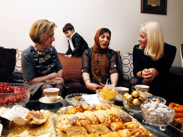 Tea Time10. mars: Dronning Sonja og Kronprinsesse Mette-Marit besøker familien Adampour. Besøket var et ledd i Antirasistisk senters kampanje Tea Time, der muslimer inviterer ikke-muslimer på te og samtale. (Foto: Lise Åserud, Scanpix) -