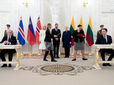 LitauenPresideanta ja Ruvdnaprinsabárra ledje fárus go Litauena finánsaministtar Vilius Šapoka ja Norgga Olgoriikadepartemeantta stáhtačálli Audun Halvorsen vuolláičáliiga guokte MoU- šiehtadusa Litauen ja Norgga bealis. Govva: Lise Åserud, NTB Scanpix. -