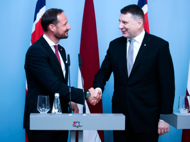 LatviaRuvdnaprinsa Haakon ja Presideanta Raimonds Vējonis lágideigga oktasaš preassadeaivvadeami maŋŋel čoahkkimiid. Govva: Lise Åserud / NTB Scanpix -