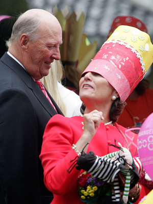 I Rektorhagen på Kongsgård var det stelt i stand bursdagsfest, og 300 barn deltok i selskapet. De tok i mot jublianten med bursdagssang, ballonger og gaver de hadde laget til Dronningen (Foto: Alf Ove Hansen / Scanpix)