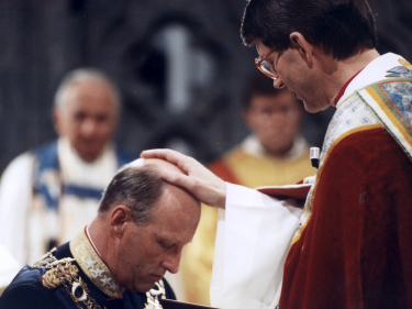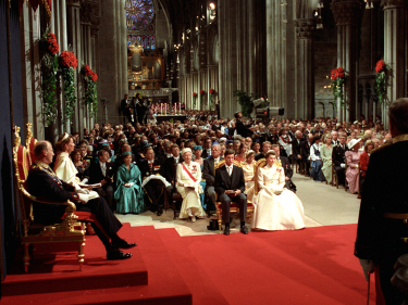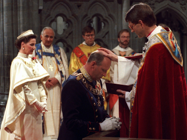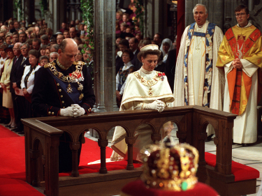 Gonagas Harald ja Dronnet Sonja čippostallaba Nidarosdomen áltáris (Govva: Bjørn Sigurdsøn, Scanpix)