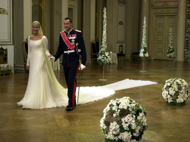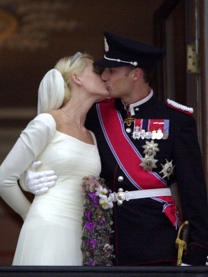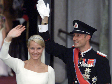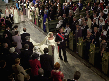Ruvdnaprinsabárra náitalii Oslo Duopmogirkus borgemánu 25. beaivvi 2001. Dá: Ruvdnamoarsi boahtá girkui ja Ruvdnaprinsa Haakon vuostáiváldá su (Govva: Lise Åserud / Scanpix)