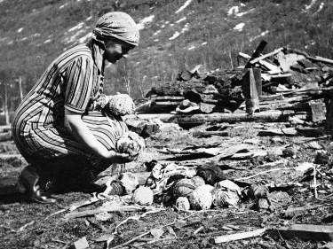 GjenreisningKong Haakon besøkte krigskirkegården i Harstad under reisen i Finnmark. Fotograf ukjent, De kongelige samlinger. -