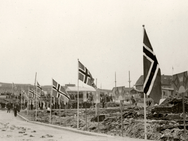GjenreisningKong Haakon ønsket å se ødeleggelsene og gjenreisningsarbeidet. I 1946 reiste han langs kysten av Finnmark med jageren Stord. Ødeleggelsene var enorme. Her er det Vardø som ønsker Kongen velkommen. Fotograf ukjent, De kongelige samlinger. -