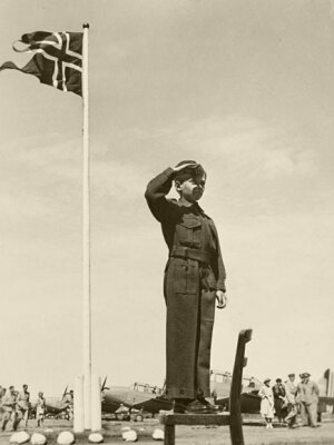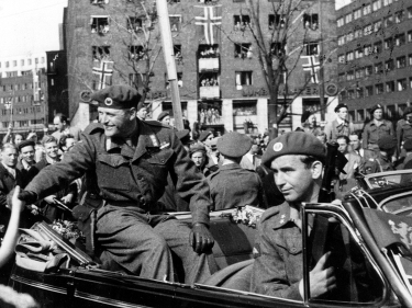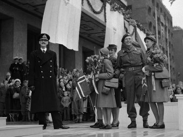 Ruoktotboahtin 1945Miessemánu 13. beaivvi 1945 máhcai Ruvdnaprinsa Olav Norgii. Max Manus lea heaggavákta (Govva: NTB/Scanpix) -