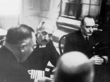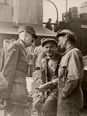 NybergsundCuoŋománu 10. beaivvi bođii duiska sáttaolmmái Curt Bräuer Gonagas Haakonii duiskalaččaid gáibádusain. Gonagas ii miehtan sin gáibádusaide. Ráđđehus attii seamma vástádusa. Duiskalaččat vástidedje garra girdifallehemiiguin. Dá ohcá Gonagas suoji vai ii deaivvahala duiska girdibombbaide Nybergsunddas cuoŋománu 11. beaivvi 1940. Govva: Johan Wilhelm Clüver. Gonagaslaš hoava vuorkágovva. -