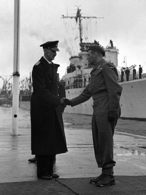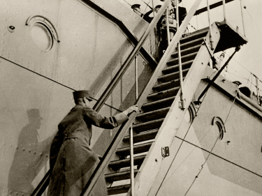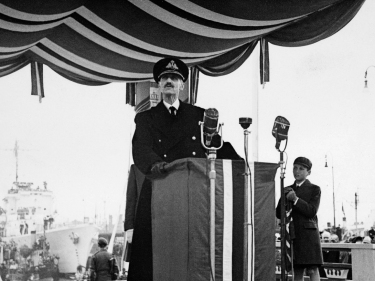 HjemkomstDen 5. juni 1945 gikk Kong Haakon om bord i HMS Norfolk i Edinburgh til lyden av «Ja vi elsker». Det var starten på reisen hjem til Norge. Foto: Royal Navy Official Photograph (UK) -