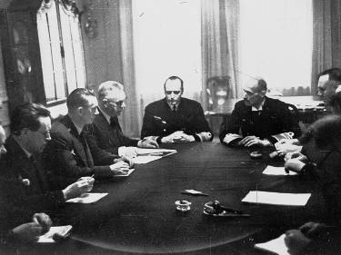 EksilregjeringStatsråd 26. september 1940. Fra venstre: Anders Fjelstad, Arne Sunde, Birger Ljungberg, Sverre Støstad, Trygve Lie, Hans Ystgaard og statsminister Johan Nygaardsvold, Kong Haakon, Kronprins Olav, Halvdan Koht, Nils Hjelmtveit, Oscar Torp, Terje Wold, Olav Hindahl og Sven Nielsen. Fotograf ukjent, De kongelige samlinger -