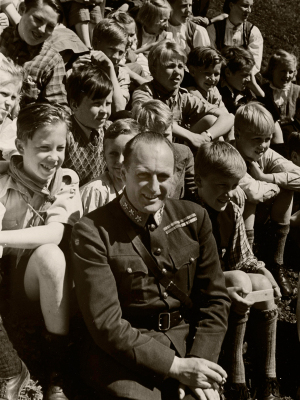 Bajemus- kommanderendeGonagas Haakon ja Ruvdnaprinsa Olav ságastallamin generálain Otto Ruge, guhte lei Norga soahteveahkagotti bajemuskommanderende (Govva: Scanpix) -