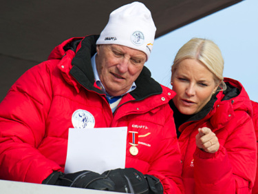 Árbevieru mielde lea Gonagasbearaš gehččiid searvvis go 120. Holmenkollen njuikemat lágiduvvojit. Gonagas Harald ja Ruvdnaprinseassa (Govva: Stella pictures)