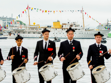 Fjerde stopp: BergenBuekorps trommer Kongefamilien i land på Bryggen i Bergen. Foto: Vegard Wivestad Grøtt / NTB scanpix -