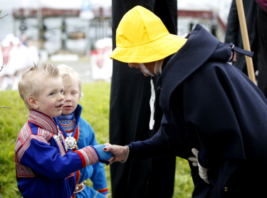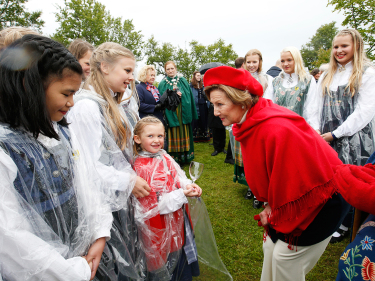 BodøDronningen hilser på Enya Aurora Hansen (6 år) og koret Lahko Voices på hagefesten. Foto: Lise Åserud, NTB scanpix. -