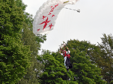 BergenFallskjermhoppere i bunad kom også til hagefesten. Foto: Sven Gj. Gjeruldsen, Det kongelige hoff -