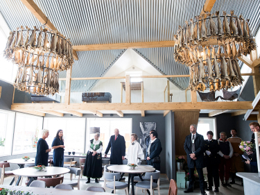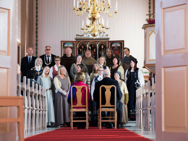 RøstGonagasbárra beasai dárkilit geahčadit Røst girku ovddolaš áltártávvala, mii lea ráhkaduvvon 1500-logus. Govva: Berit Roald / NTB Scanpix -