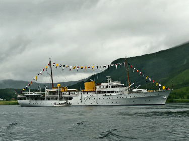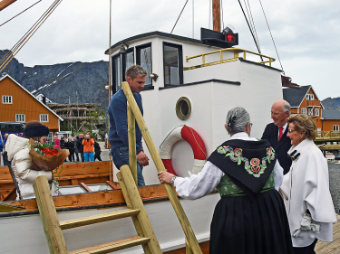 MoskenesGonagasskiipa olggobealde Reine Moskenesas. Govva: Sven Gj. Gjeruldsen, Gonagaslaš hoavva -