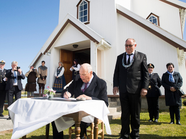 RøstGonagasbárra finai Røsta girkus, gos soai signeriiga ođđa Gonagas- ja dronnetgeađggi. Dat galgá biddjojuvvot olggobeallái girku, dan geađggi lusa masa Gonagas Olav V čálii namas 1963:s . Govva: Berit Roald / NTB Scanpix -