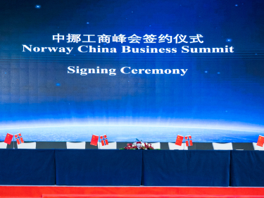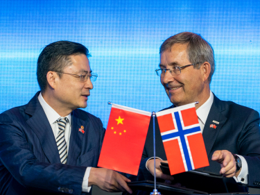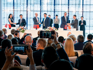 ShanghaiNorgga ja kiinnálaš fitnodagat vuolláičálle oktanuppelohkái ođđa šiehtadusa konferánssas. Govva: Heiko Junge, NTB Scanpix -