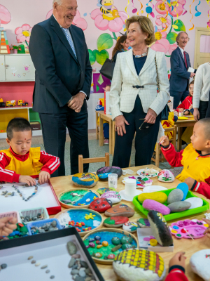 ShanghaiGonagas Harald ja Dronnet Sonja deaivvadeigga maid báikkálaš eiseválddiiguin. Govva: Tim Haukenes