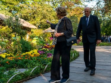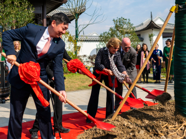 ChangshuDronnet Sonja gilvá muora skuvlla párkii ovttas stivrra ovdaolbmuin Mark Jiapeng Wang ja rektoriin Pelham Lindfield Roberts. Govva: Tim Haukenes -