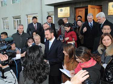 Mongolia 2008Ruvdnaprinsa Haakon deaivvada mongolalaš preassain olggobealde Senter for fri rettshjelp, Ulan Bator (Govva: D. Rentsendorj, Montsame news agency) -
